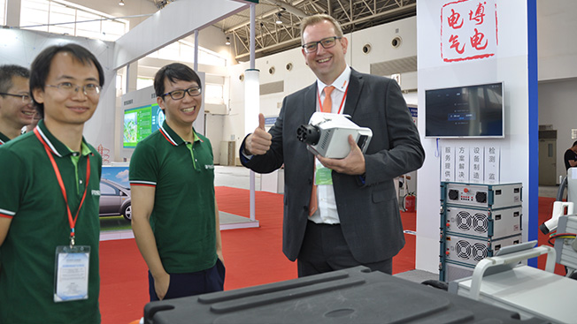 ▲來自德國的技術(shù)專家為博電手持式電動汽車充電檢測儀點贊