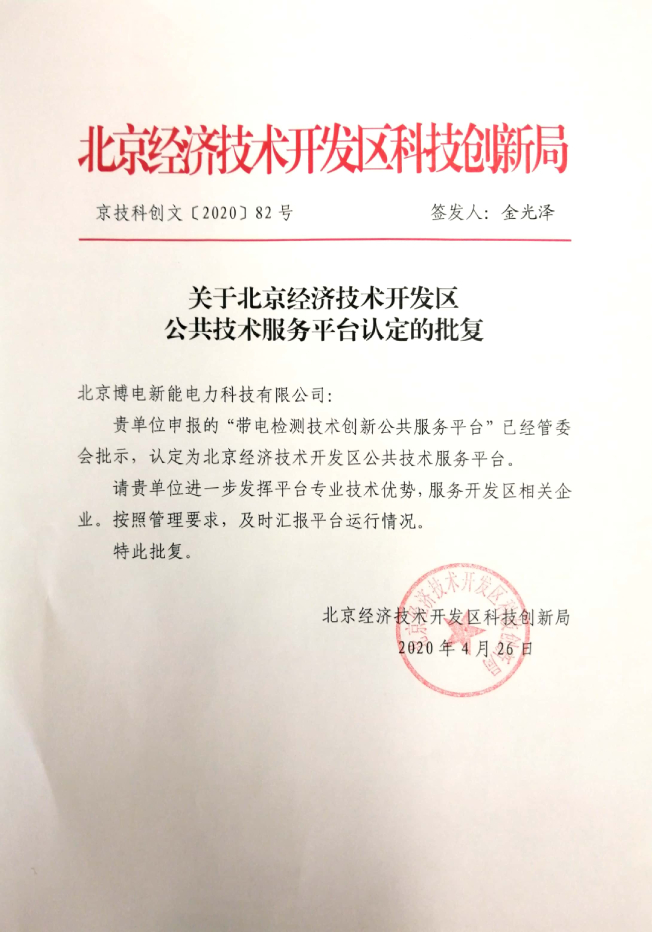 日前,北京經(jīng)濟技術(shù)開發(fā)區(qū)科技創(chuàng)新局評定了2020年度公共技術(shù)服務(wù)平臺名單,北京博電新力電氣股份有限公司全資子公司——北京博電新能電力科技有限公司(簡稱“博電新能”)名列其中,其帶電檢測技術(shù)創(chuàng)新公共服務(wù)平臺被認(rèn)定為“北京經(jīng)濟技術(shù)開發(fā)區(qū)公共技術(shù)服務(wù)平臺”。