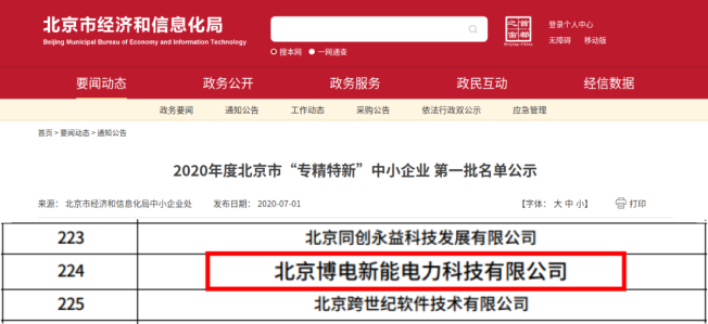 7月1日,北京博電新力電氣股份有限公司全資子公司——北京博電新能電力科技有限公司(簡稱“博電新能”)成功入選由北京市經(jīng)濟和信息化局中小企業(yè)處遴選的2020年度北京市“專精特新”中小企業(yè)(第一批)。當(dāng)前,第一批入圍名單正在北京市經(jīng)濟和信息化局官方網(wǎng)站上公示。