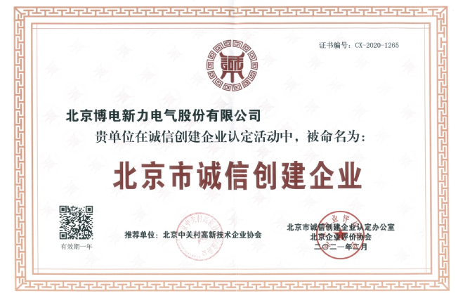 博電科技由北京北京中關(guān)村高新技術(shù)企業(yè)協(xié)會推薦,通過層層篩選,最終不負眾望,摘得“北京市誠信創(chuàng)建企業(yè)”稱號。
