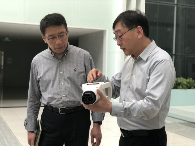 ▲陳總演示手持式電動(dòng)汽車檢測(cè)儀使用方法
