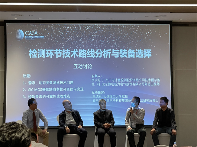 本次研討會(huì)的專題討論環(huán)節(jié),共分為襯底、外延、芯片、封裝、檢測技術(shù)路線與裝備選擇五個(gè)環(huán)節(jié)。檢測環(huán)節(jié)技術(shù)路線分析與裝備選擇專題的召集人之一——博電科技副總工程師杜科博士與大連理工學(xué)院王德君教授、中國電子科技集團(tuán)公司第十三研究所翟玉衛(wèi)博士等專家圍繞靜態(tài)/動(dòng)態(tài)參數(shù)測試技術(shù)問題,SiC MOS柵氧缺陷參數(shù)分離如何實(shí)現(xiàn),特殊要求的可靠性試驗(yàn)難點(diǎn)等議題展開研討。