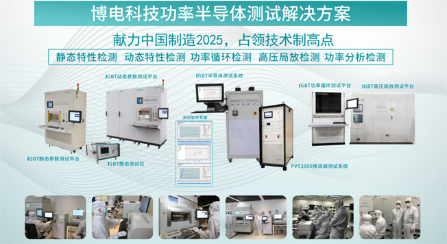在功率半導(dǎo)體測試領(lǐng)域,博電科技推出以高速高頻、高壓、大電流功率源為基礎(chǔ)、并結(jié)合高速高精度的高壓、大電流模擬采集技術(shù)及高速數(shù)字處理控制系統(tǒng)的智能測試平臺(tái)。該平臺(tái)根據(jù)不同需求可完成各類功率半導(dǎo)體器件、模塊、芯片的動(dòng)態(tài)參數(shù)、靜態(tài)參數(shù),熱力參數(shù)及力學(xué)參數(shù),功率壽命參數(shù)測試;是國內(nèi)相關(guān)研制生產(chǎn)單位的研發(fā)測試、工程驗(yàn)收、出廠測試等領(lǐng)域進(jìn)行自動(dòng)測試的檢測平臺(tái)。