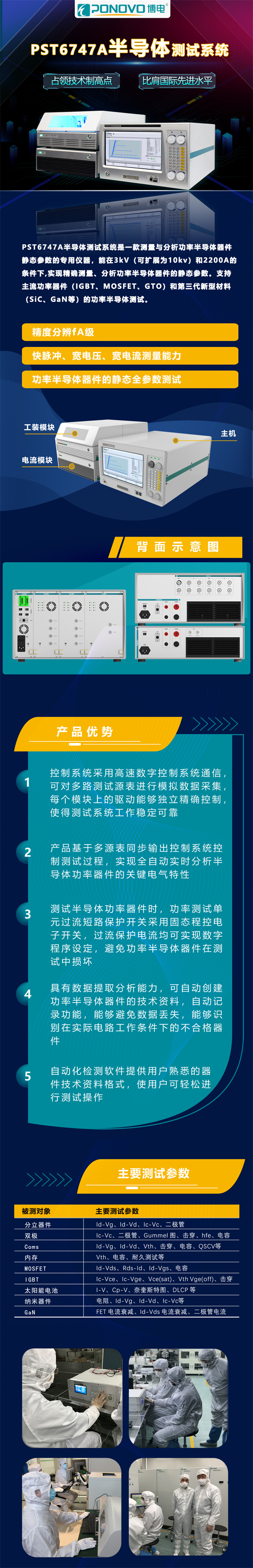此次展覽,博電科技重點(diǎn)展示了依托中國制造實(shí)現(xiàn)進(jìn)口替代的高端科學(xué)儀器—— PST6747A半導(dǎo)體測試系統(tǒng)。該系統(tǒng)可實(shí)現(xiàn)對(duì)IGBT、MOSFET、GTO等主流功率器件及GaN、SiC等第三代功率半導(dǎo)體器件的靜態(tài)全參數(shù)測試,該產(chǎn)品對(duì)標(biāo)國際同類產(chǎn)品,是具有快脈沖寬電壓,精度分辨達(dá)f##電流檢測能力的功率半導(dǎo)體檢測設(shè)備。