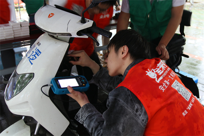 上午10點(diǎn),啟動(dòng)儀式在陶然亭街道南華里社區(qū)成功舉行后,轄區(qū)居民陸續(xù)將電動(dòng)自行車停放至活動(dòng)現(xiàn)場積極參與檢測。