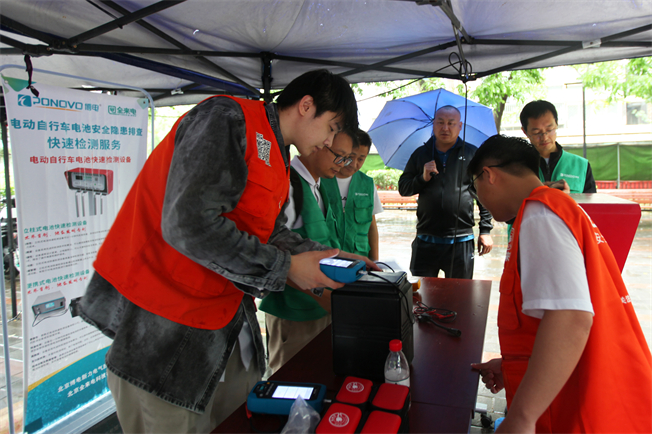 博電科技技術(shù)人員采用專業(yè)的“一車一池一充一碼”安全隱患排查檢測終端對電動(dòng)自行車和電池情況進(jìn)行快速檢測,篩選問題車輛、電池及充電器。