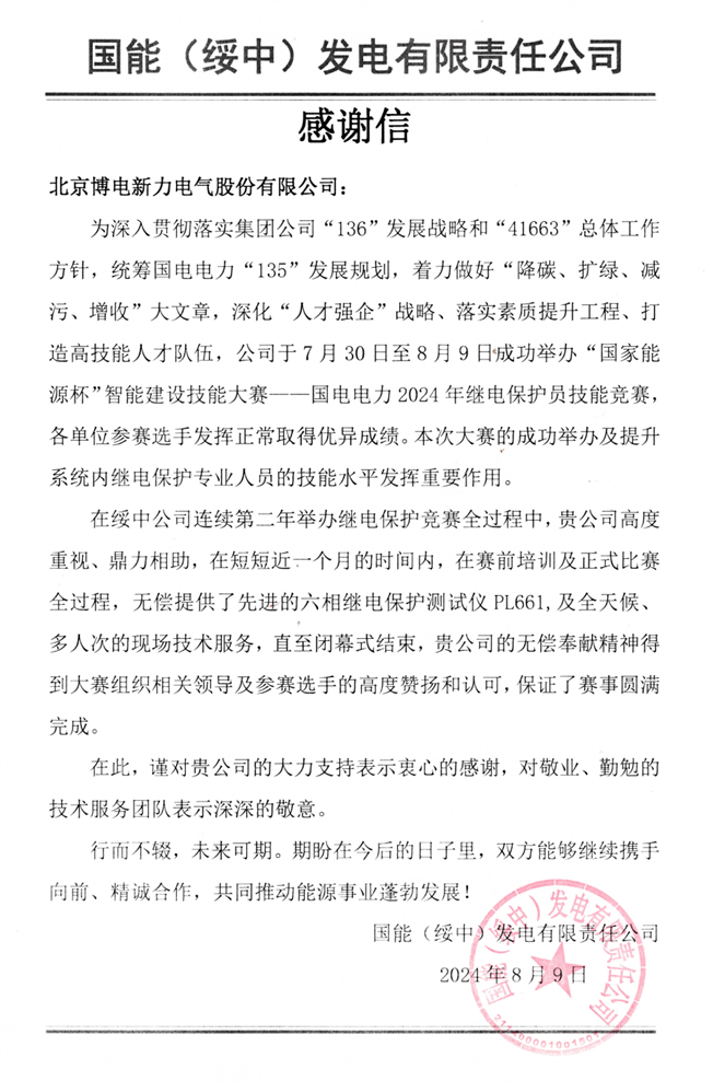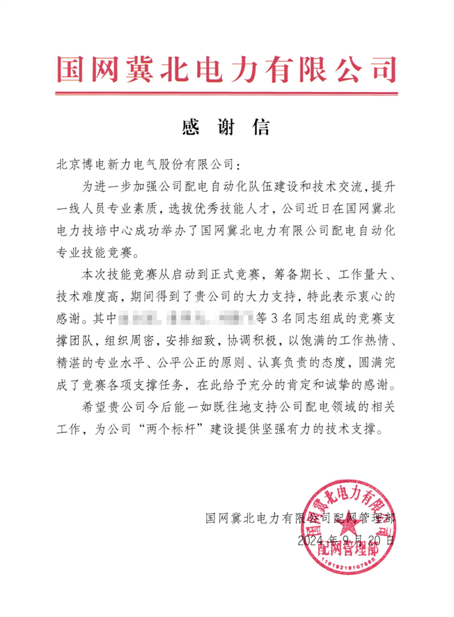 近日,北京博電新力電氣股份有限公司(簡稱“博電科技”)陸續(xù)收到國能(綏中)發(fā)電有限責任公司和國網(wǎng)冀北電力有限公司配網(wǎng)管理部發(fā)來的感謝信。兩封感謝信均高度評價了博電科技在保障電力系統(tǒng)相關(guān)技能競賽中發(fā)揮的重要作用。