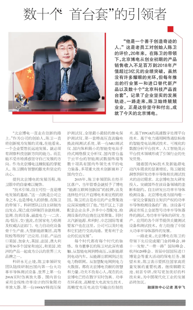 2020年10月14日,《亦城時報》第645期第7版發(fā)表題為《數(shù)十個“首臺套”的引領(lǐng)者》的特別報道,為博電科技董事長陳衛(wèi)及博電科技在電力檢測領(lǐng)域做出的成績點贊。