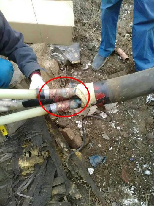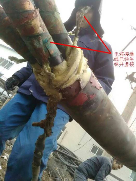 35kV某線01號桿電纜,通過WUD-011配電線路巡檢儀檢測清晰的聽到較強的放電聲音,經(jīng)WUD-011準確定位后觀察發(fā)現(xiàn):該電纜終端護套位置發(fā)生放電。拆解后發(fā)現(xiàn)三相半導(dǎo)電層均有不同程度的損傷,金屬屏蔽層銹蝕,且接地線銹蝕嚴重、連接不實導(dǎo)致嚴重的放電發(fā)生。